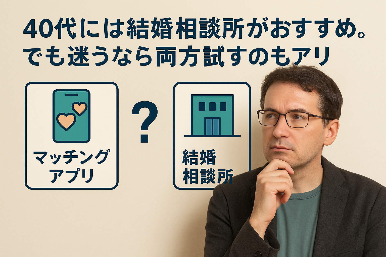 今回は、40代男性が婚活を始めるときに必ずと言っていいほど迷う選択肢、