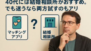 40代男性の婚活で迷う「マッチングアプリか結婚相談所か」。両者のメリット・デメリットや向いている人の特徴を実体験を交えて解説。自分に合った婚活方法を見つけるヒントになります。